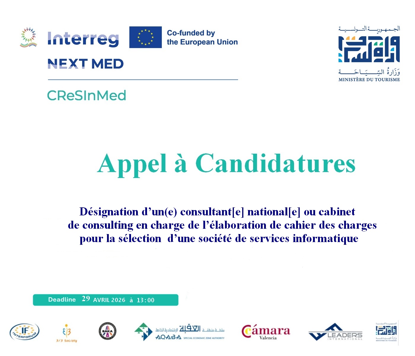 Dans le cadre du projet « Competitiveness and Internationalisation of Rural Tourism SMEs in the Mediterranean, CReSInMed», le Ministère du Tourisme annonce l’ouverture de candidature pour les consultants et les cabinets de consulting nationaux afin d’élaborer un cahier des charges pour la sélection d’une société de services informatique»